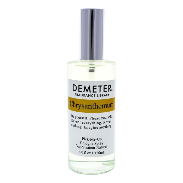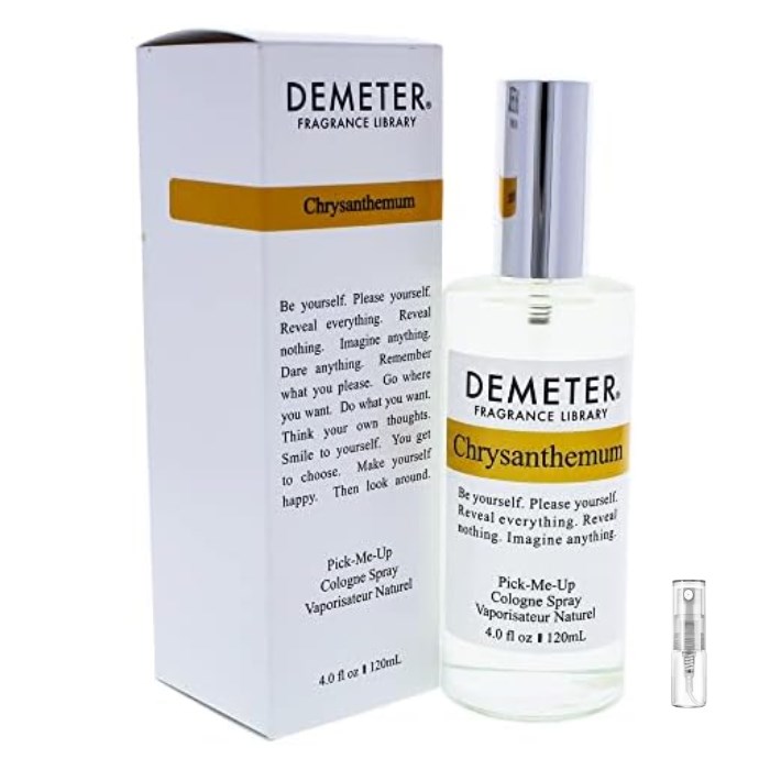 Homepage › Parfums › BRAND › Demeter Notice: All products are 100% original perfumes in tester packaging. Due to regulations, brand names and logos are not displayed in the images Demeter Demeter Chrysanthemum - Eau De Cologne - Perfume sample - 2 ml Product number: TPS-3227- 2ML 1999 Choose size Choose variant 5,95 EUR Including VAT plus delivery costs Available - In 5-10 working days to you Amount Add to Cart From 5€ shipping cost Guaranteed genuine Purchase by invoice (Klarna) free sample Placeholder Placeholder Placeholder Placeholder Placeholder Placeholder Placeholder Product Recommendations Product descriptionProduct ingredients Demeter Chrysanthemum - Eau De Cologne - Perfum Sample INCI List ALCOHOL DENAT, CAPRYLIC,CAPRIC TRIGLYCERIDE, FRAGRANCE (PARFUM,FRAGANCIA) WATER(EAU, AGUA) Manufacturer contact Demeter Fragrance Library 12 North Gate Road, Great Neck, NY 11023 USA